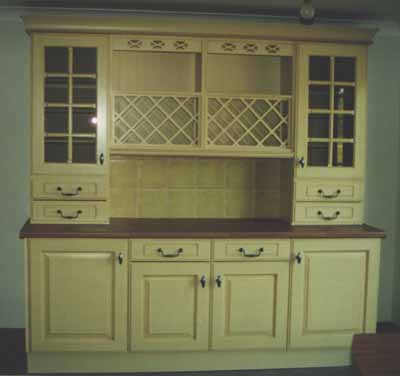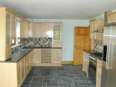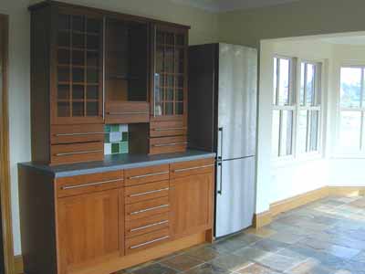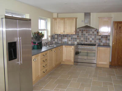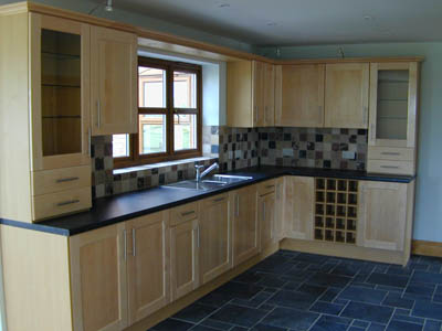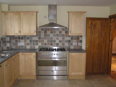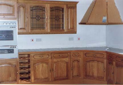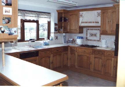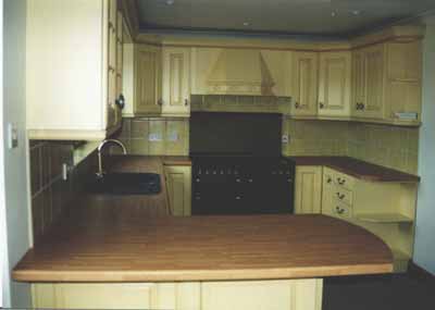 | This kithen/family room has a glazed peninsular to separate the rooms and also you can see the purpose made hardwood windows with a special leaded design unique to us. | Typical oak kitchen with tiled worktop and a tiled canopy under construction | ||